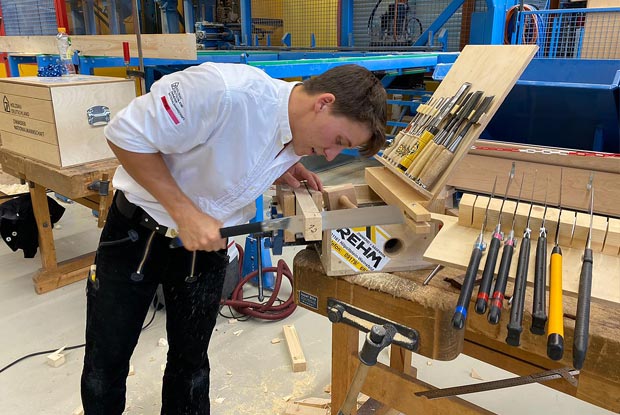 Marco Schmidt (22) gehört seit 2019 zur Zimmerer-Nationalmannschaft. Als Geselle arbeitet er im Innungsbetrieb Zimmerei Rehm in Hilpoltstein (ZI Schwabach/Roth/Hilpoltstein). Sein Chef ist Zimmerer-Weltmeister 2015 Simon Rehm. Im Interview verrät Marco Schmidt unter anderem, wie sich das Team in Pandemie-Zeiten fit hält und inwiefern er von der Wettbewerbserfahrung seines Chefs profitiert.