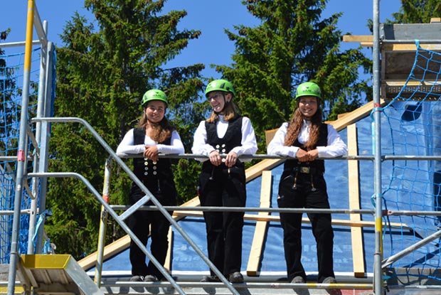 Bereit für die Baustelle: Die drei Cousinen auf dem Weg zum Dachfirst.