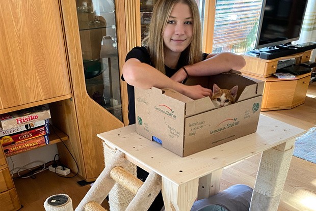 Ihr Wissen aus dem BGJ hat Christina Hartl zuhause praktisch angewandt und einen Kratzbaum aus Holz für ihre zwei Katzen gebaut. Denn im Berufsgrundschuljahr hat sie gelernt, wie sie Muster in eine Holzsäule hineingestemmt , das hat sie an der vorderen Säule des Kratzbaumes umgesetzt.