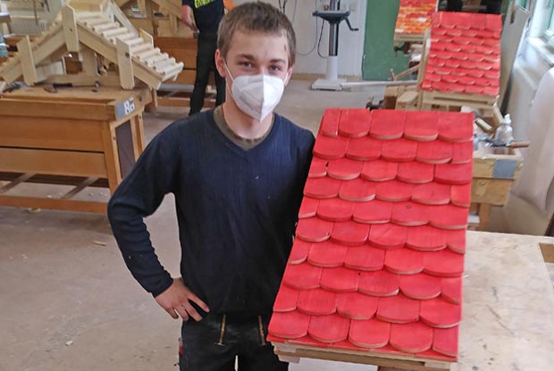 Aktuell ist aber wieder Berufsschule in Traunstein angesagt. Der Fachlehrer für Zimmerer-Praxis Alexander Sedlmaier erklärt: „Bis Pfingsten bleiben wir noch bei den Dachstühlen und wechseln dann in den Treppenbau.“ Vor kurzem haben Maxi Kirr und seine Schulkollegen ein Modell eines einfachen Pfettendachstuhls gebaut. Er erzählt „Die Schwierigkeit war, die Dachlatten mit der Handsäge auf die richtige Länge zu bringen, so dass die Dachschindeln gut draufpassen."
