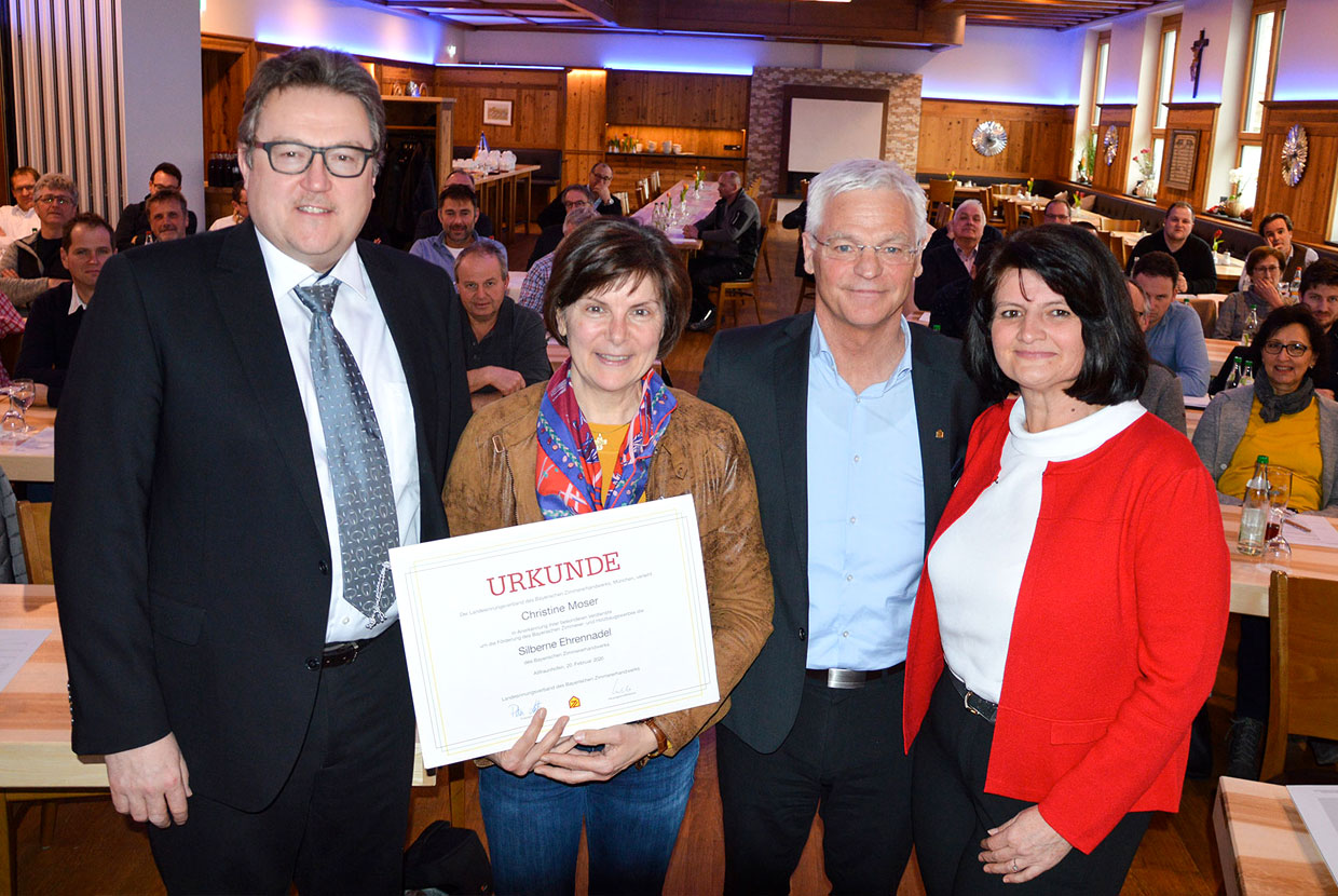 Verleihung der Silbernen Ehrennadel des Bayerischen Zimmererhandwerks: v.l. Bezirksvorsitzender Anton Schiller, die Geehrte Christine Moser, LIV-Präsident Peter Aicher und die Vertreterin der Unternehmerfrauen Christine Schiller.