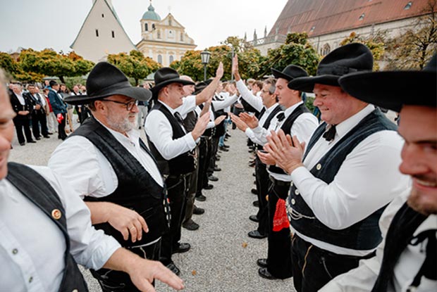 Beim Verbandstag 2019 des LIV in Altötting kamen zahlreiche Innungsmitglieder in traditioneller Kluft, hier sogar mit Stenz.