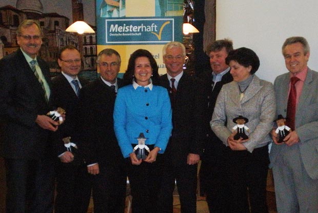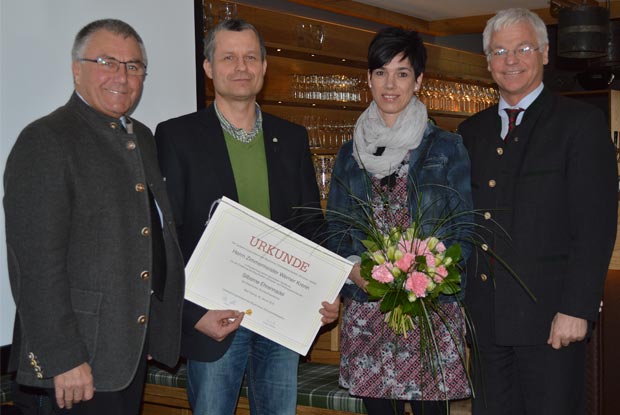 Verleihung der Silbernen Ehrennadel des Bayerischen Zimmererhandwerks: v.l. Bezirksvorsitzender Anton Schiller, die Geehrte Christine Moser, LIV-Präsident Peter Aicher und die Vertreterin der Unternehmerfrauen Christine Schiller.