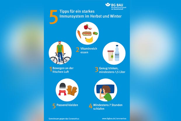 „5 Tipps für ein starkes Immunsystem im Herbst und Winter“, lautet der Titel eines neuen Plakats der BG BAU. Damit ruft sie ihren Mitgliedsunternehmen und Versicherten neben dem AHA+L-Prinzip wirksame Tipps für die kalte Jahreszeit ins Bewusstsein.